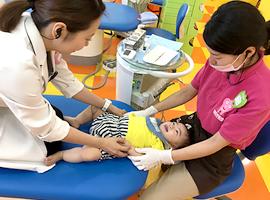 実際検査をしている娘の写真です。ベットに横になって歯から歯垢を4ヶ所とって、舌に木のヘラ(のようなもの)をペタペタするだけ!お母さんの検査はこれに、5分間ガムを噛んで唾液を出す作業が加わるだけです。